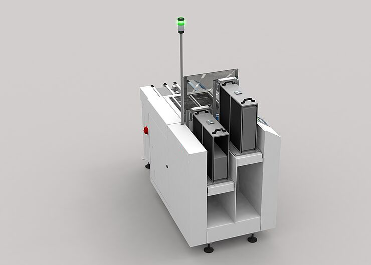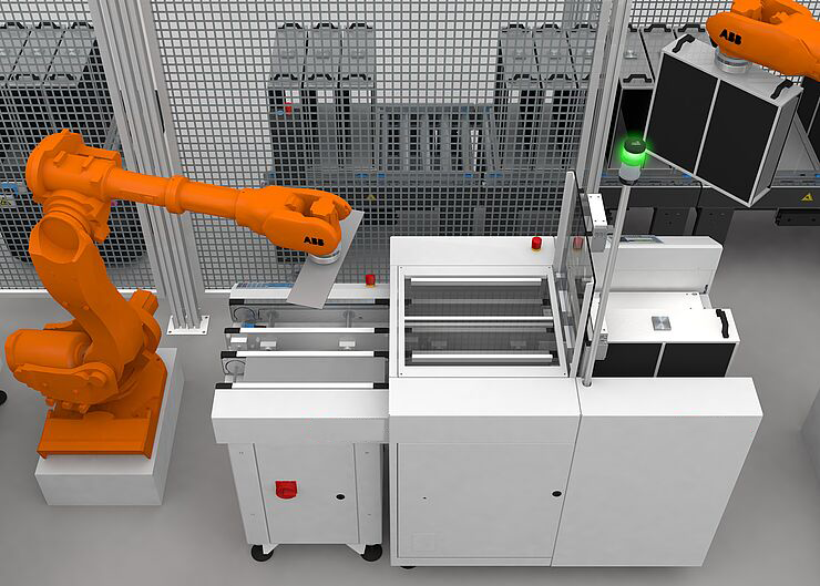 The substrates or the bipolar plate are transported from the manufacturing station to an automated intermediate storage. This can be done manually or fully automatically. The intermediate storage of the materials can take place in an Lantern GT Material Warehouse. The communication follows via a host computer system.